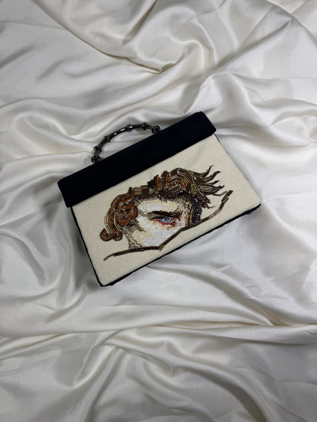 Данный тип сумки не изготавливается, возможно вышить Атланта (с такой же косой крышкой) на новой модели каркасной сумки с металлической ручкой. Возможно изменение размеров сумки, цветов ткани и фурнитуры